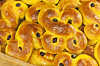 Sätt ugnen på 225 grader och pensla de färdigjästa bullarna med ett uppvispat ägg och garnera med russin. Grädda mitt i ugnen i 5-8 minuter. Klart!