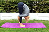 Tryck ner hälarna ordentligt i golvet och vrid låren något inåt. Låt ditt huvud hänga. Rulla inte upp ryggraden för att komma upp utan sätt istället dina händer på höfterna och tryck på svanskotan och bäckenet och gå upp i en inandning.