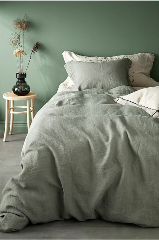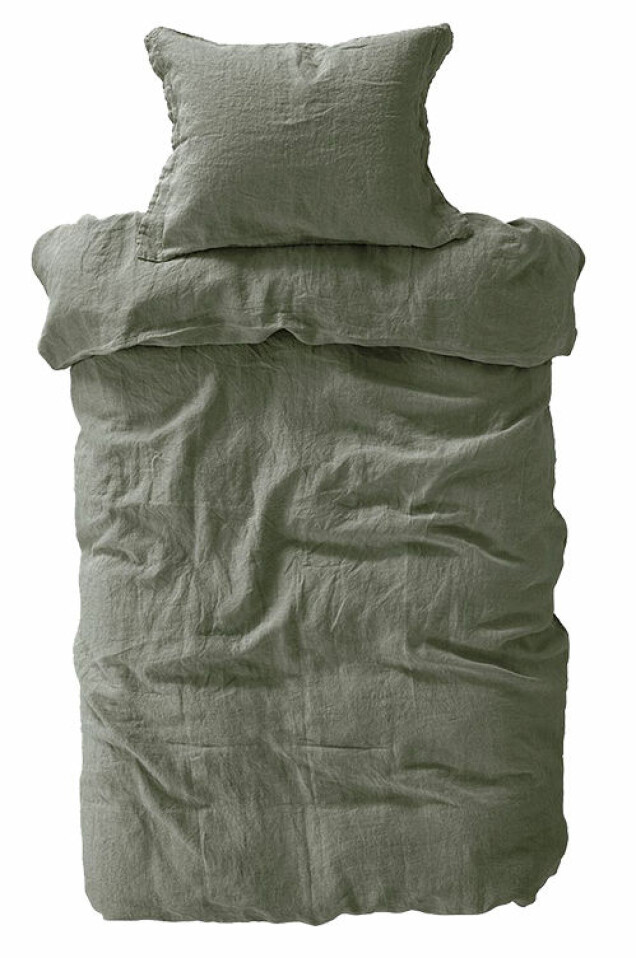 Skogsgrönt påslakanset i härlig tvättad linnekvalitet, av franskt lin från Ellos Home. Du kan köpa det här.