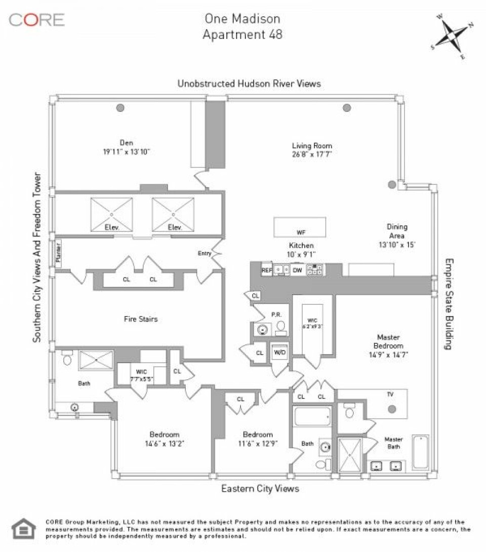 För den astronomiska summan får du en fyrarummare med tre badrum på Manhattan i distriktet Flatiron. Våningen är belägen på 48:e våningen och rummen är fördelade på 308 kvadratmeter. Mäklarfirman Core utlovar lyxiga materialval, spektakulär utsikt och en arkitektritad planlösning.