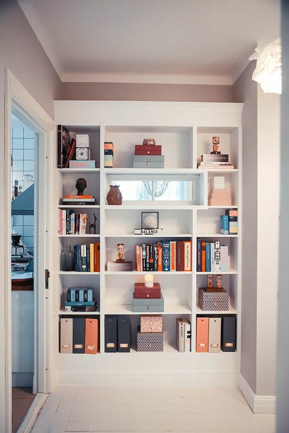 Platsbyggda bokhyllor är knappast billiga men ger direkt ett mer sammanhållet intryck. Tur då att Billybokhyllan med lite kanter runt om ser ut som om den vore platsbyggd utan att du behöver riva upp en hel vägg. Lättare, billigare och enkelt att ändra på om du ångrar dig.