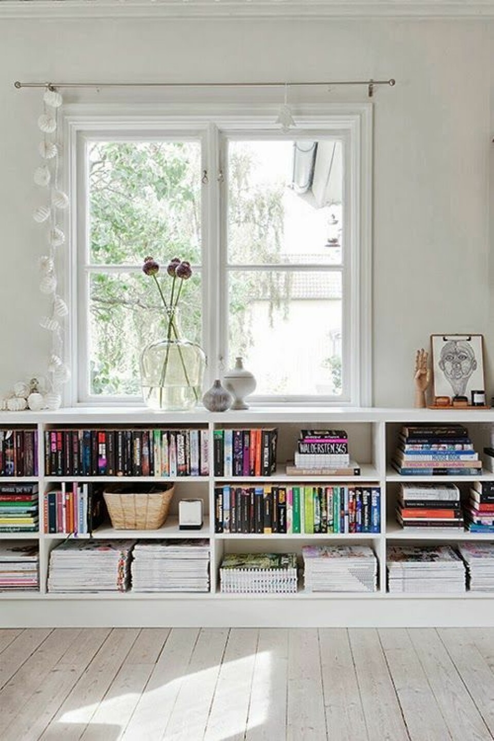 Har du fina fönster hemma du inte vill täcka för men behöver fortfarande förvaring? Placera låga Billyhyllor längs hela väggen för att både släppa in ljus och skapa bra förvaringsytor. Varför inte slänga på en pläd och använda som läshörna också?
