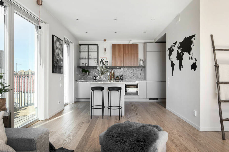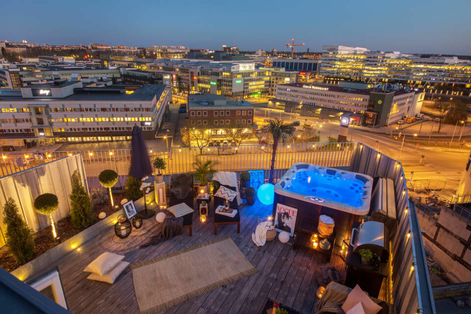 Den omtalade tvåan ligger på Vintergatan i centrala Sundbyberg. Den är placerad högst upp i huset, inredd med rejäla trägolv och lyxiga detaljer. Men det som verkligen sticker ut är takterrassen.