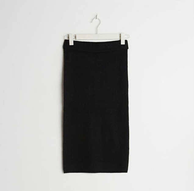 Mjuk stickad kjol i mjuk kvalitet med inslag av ull från H&M. Hög midja och klädd resor upptill samt en slits bak. Finns även i grått. Här kan du köpa den.