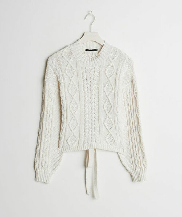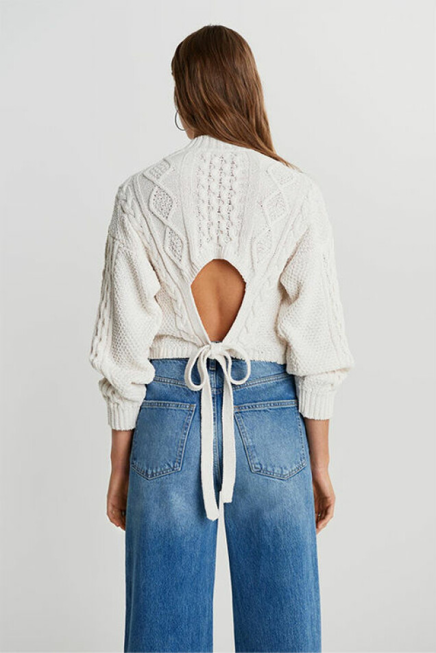 Vackert kabelstickad croppad tröja i vit nyans med öppen rygg och knytning. Här kan du köpa den.