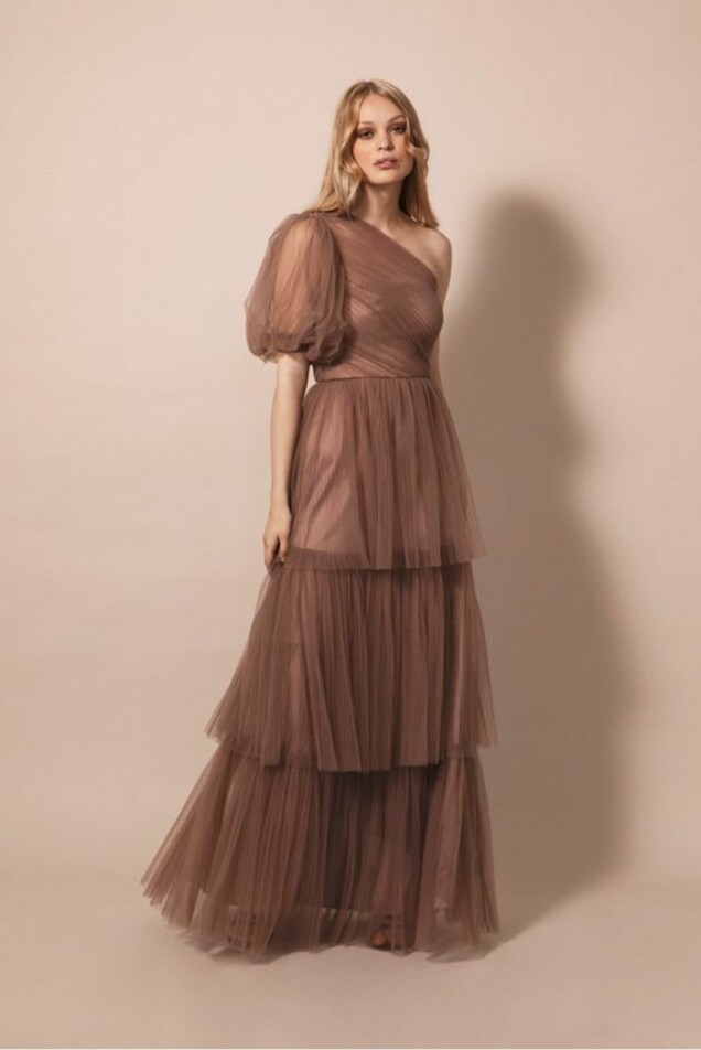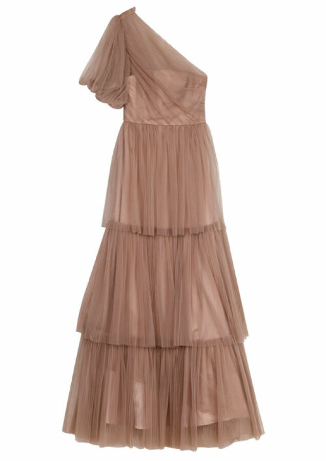 Maxiklänning med tyllager från By Malina i en one shoulder-modell. Du kan köpa den här.