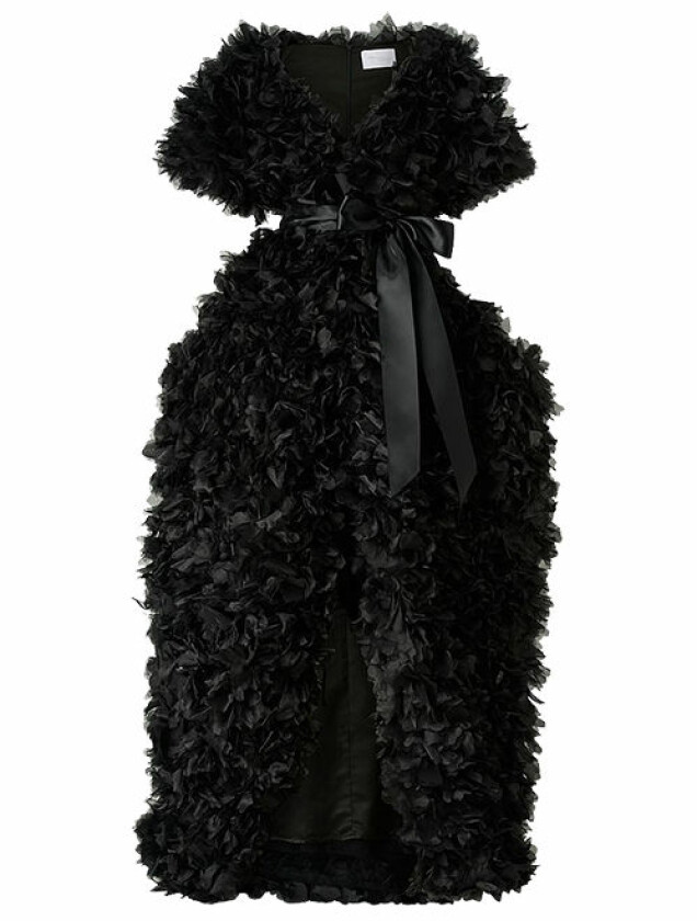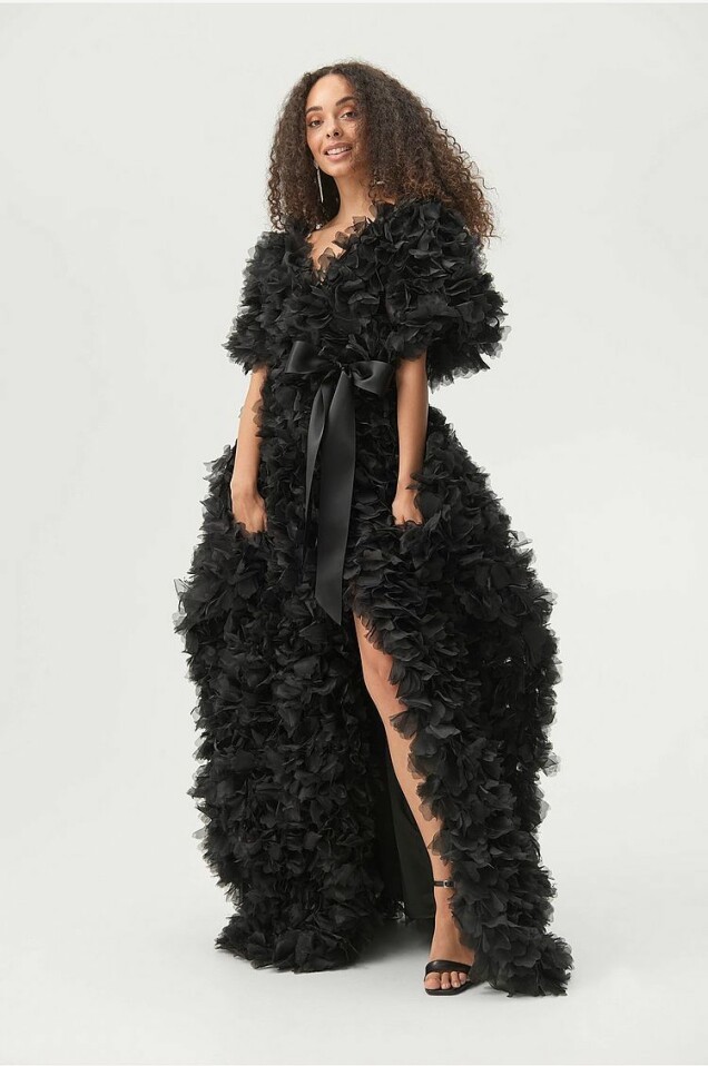 En hellång festklänning med heltäckande, vackra 3D-blommor från Selam Fessahaye x Ellos. Korta, voluminösa ärmar och utställd kjol med mycket vidd och hög slits fram. Du hittar den här.