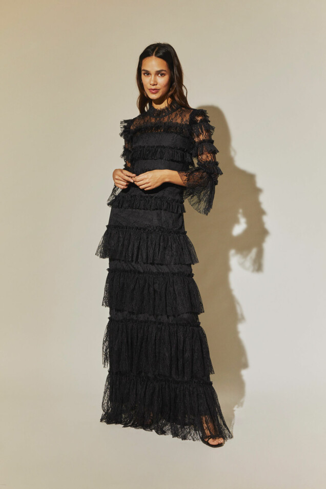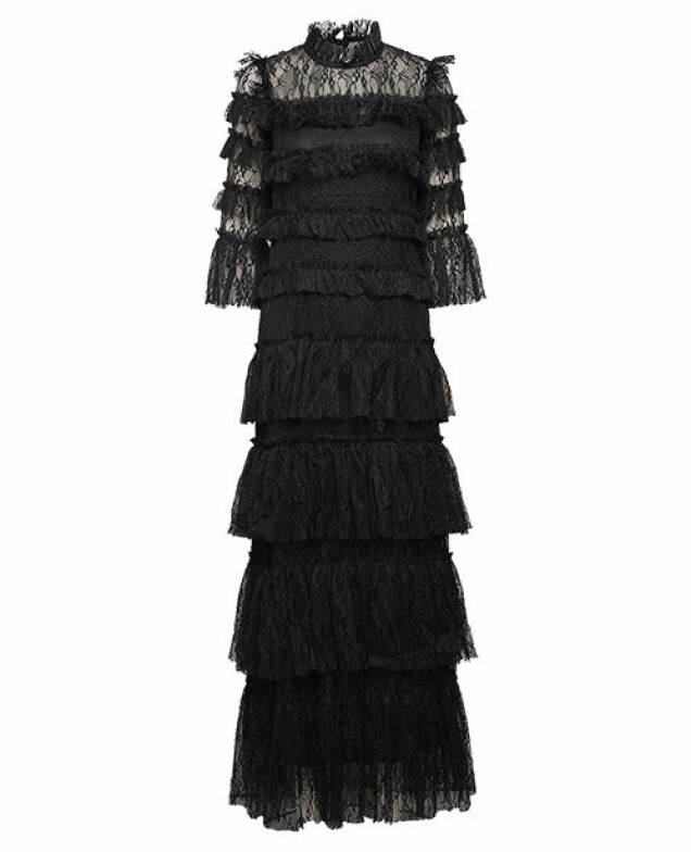 Lång spetsklänning från By Malina i en figurformad modell i genombruten spets med påsydda volanger runt om samt hög volangkrage. Finns även i vitt. Du kan klicka hem den här.
