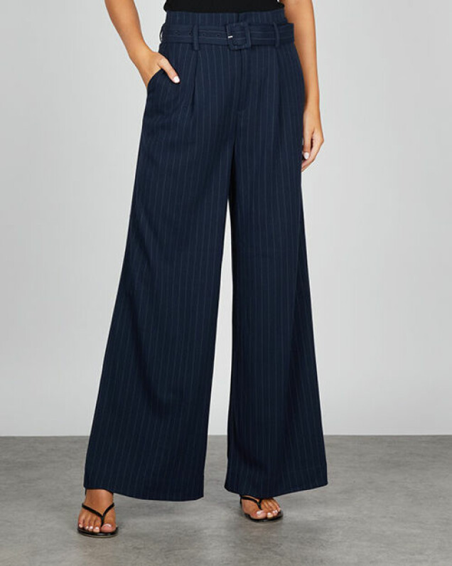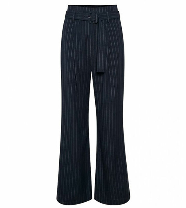 Klassiska kostymbyxor med kritstreckränder från Gestuz. Hög midja och vida ben med pressveck fram samt skärp i midjan. Du kan köpa dem här.