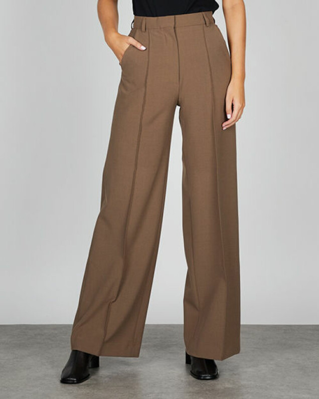 Trendig brun kostymbyxa i oversized passform med vida ben från Nanushka. Byxan är något högre i midjan och har dekorativa pressveck fram- och baktill. Du kan köpa dem här.