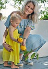 – Vi älskar ränderna, volangerna och sommarens trendiga gula inslag! Bär plaggen för sig eller matcha mor och dotter, säger Sofi och Frida.