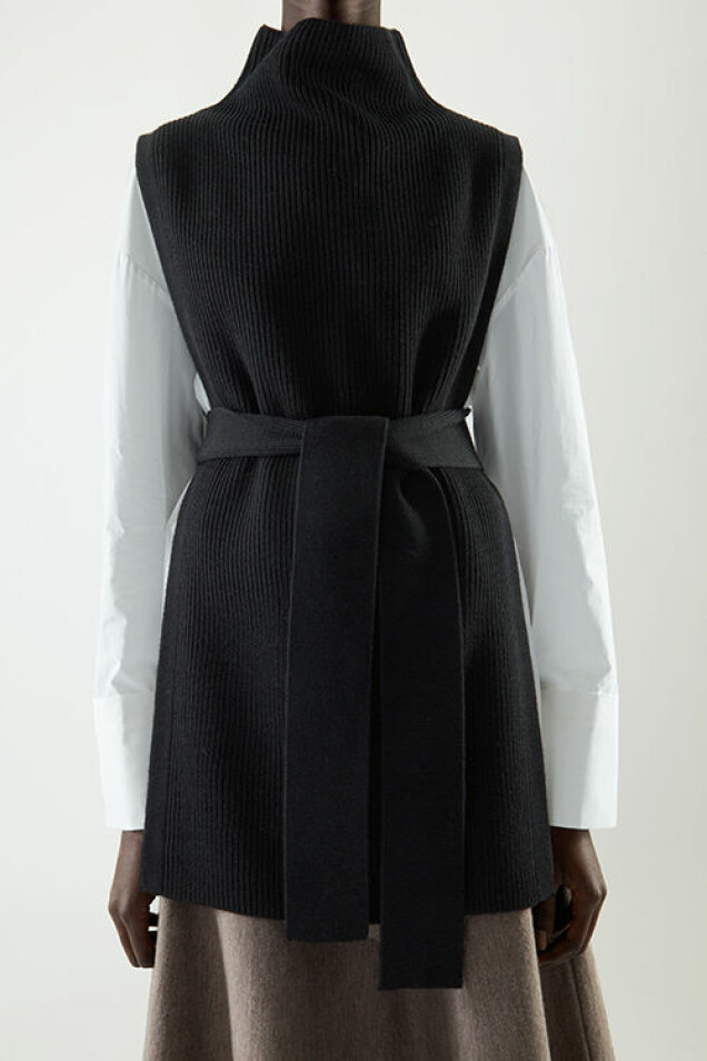 Stilren väst från Cos med ett brett bälte i midjan och sidoslitsar. Tillverkad av hållbart ull. Du hittar den här.