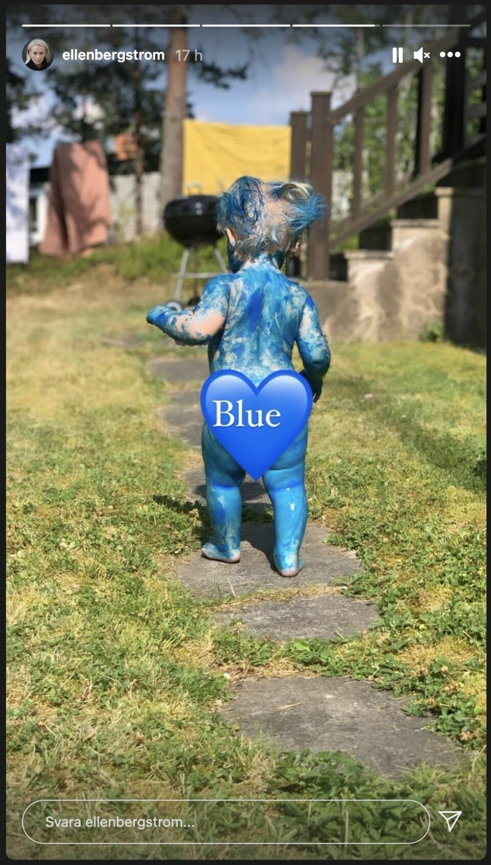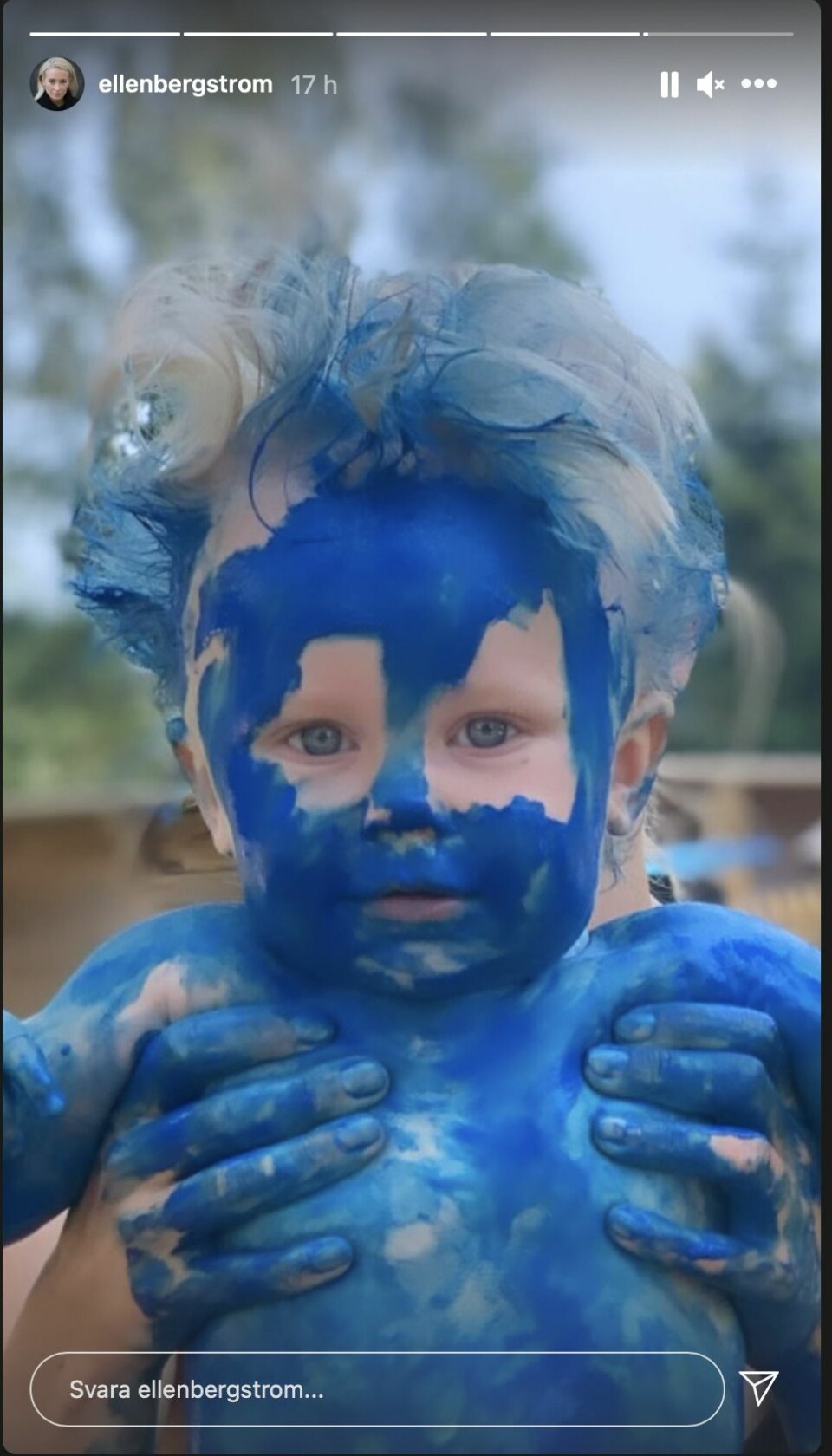 Hon postar även bilder i Instagram story som visar hur dottern är helt täckt i blå färg: