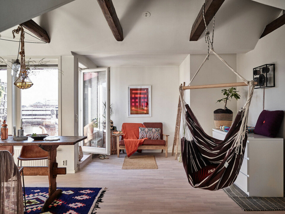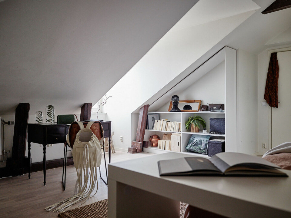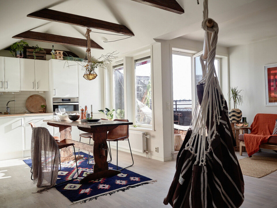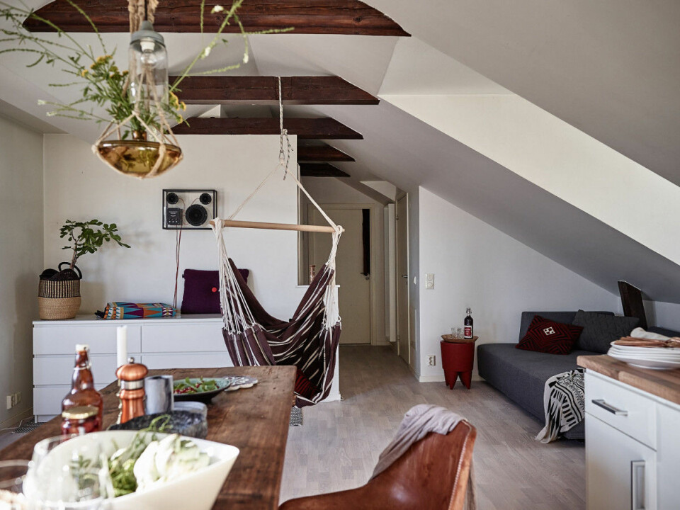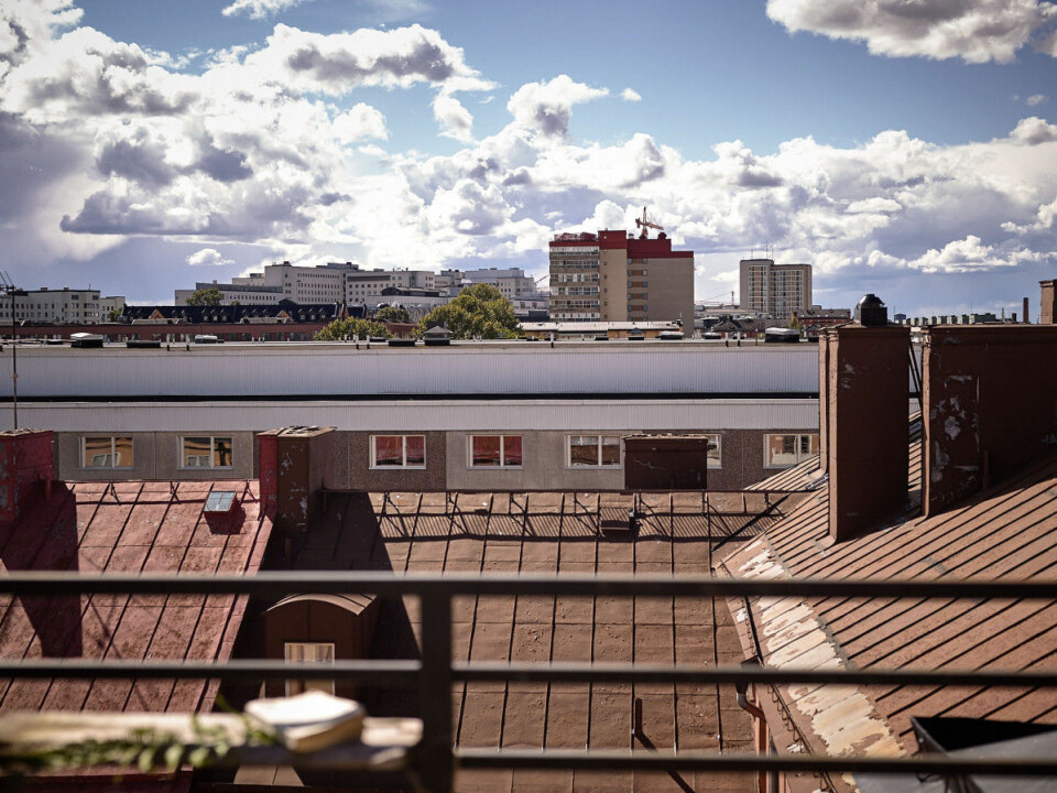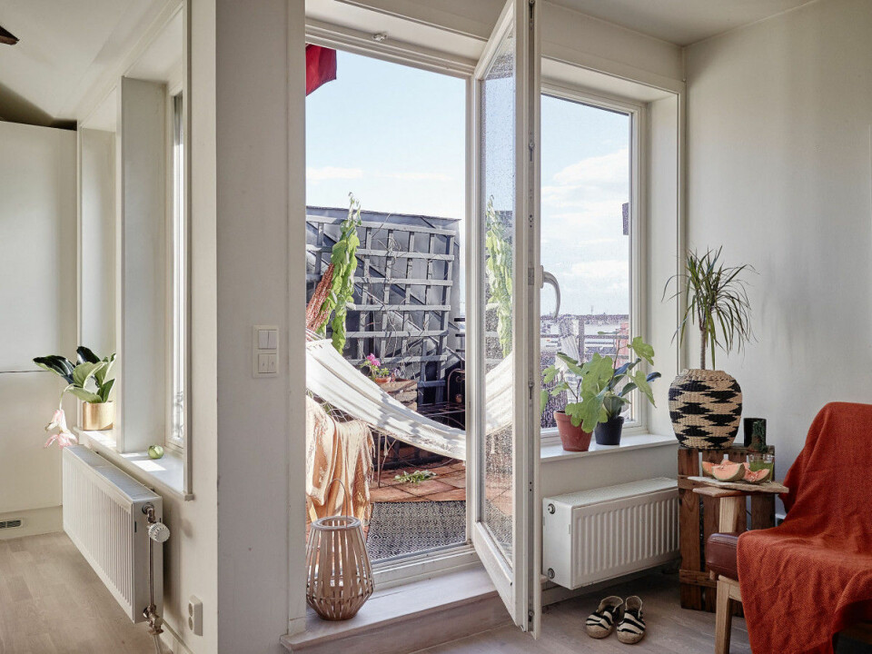 Lägenheten är en vindsvåning om 68 kvadratmeter fördelat på två rum och kök med en takterrass. Den ligger på Södermalm och enligt objektsbeskrivningen kan du som ny ägare njuta av utsikt över söders takåsar och bada i ett badkar mot ett fönster.